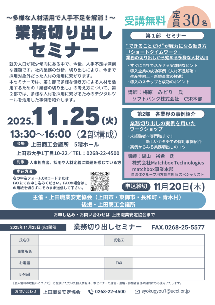 上田職業安定協会では、就労人口が減少傾向にある中で、課題となる人手不足への対応として、多様な働き方による人材を活用するため社内業務の分析、業務の切り出しをテーマにセミナーを開催します。